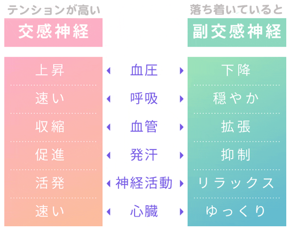 人はお仕事やスポーツなど活発に活動する時に活躍する交感神経のに対し、副交感神経は人をリラックスさせます。